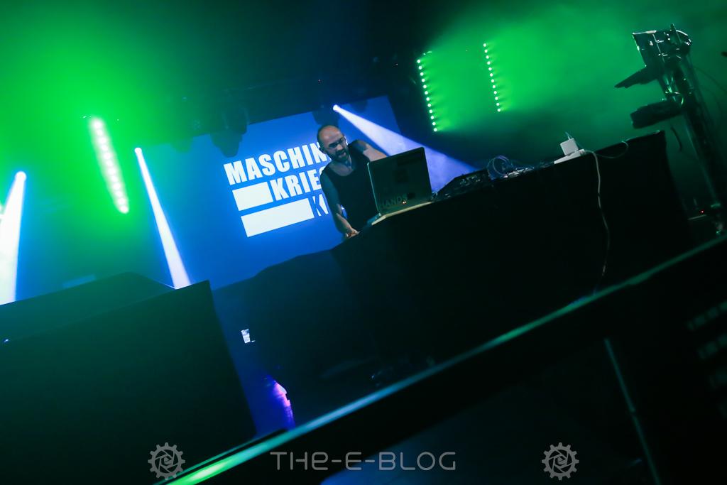 Als Opener hat man viele Möglichkeiten, man kann freundlich Hallo sagen, das Publikum mit kleinen Reden begrüßen, seinen Sound mit Einflüssen über Beatles, Mozart und Höhlenmalerein beschreiben.... Kann man, man kann aber auch gleich n kleines Bassgewitter entfachen, den Saal mit Sequenzen fluten und für die Anwesenden die Raumluft mal gut umwälzen. So macht das Maschinenkrieger KR 52. Einmal mit Druck durch die Halle fegen. Staub wischen auf den Boxen muss jetzt keiner mehr. Wach waren ab dem Moment alle, einige am Tanzen. Die Nacht war eröffnet.